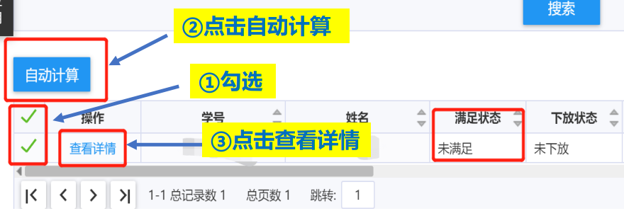 3.审查信息所有项为“是”,勾选并点击自动计算,满足状态为“已满足”即完成毕业自查。