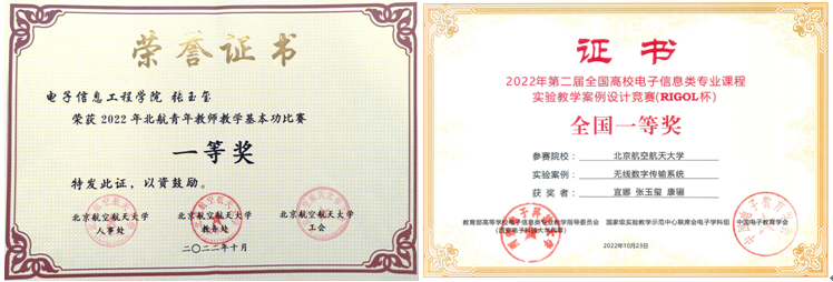 “空天电子信息实验教学团队”获2022年度北京高校优秀本科育人团队称号。形成了具有空天信特色、零基础实验、课程实验、综合创新实验、科研课堂的层次化实验培养体系,培养学生的实践创新能力。2022年我院学生科技实践再创佳绩,挑战杯、大学生电子竞赛、蓝桥杯、集成电路设计大赛、大唐杯和圆梦杯等科技创新活动中取得优异成绩,共获省部级以上科技竞赛奖励278项。