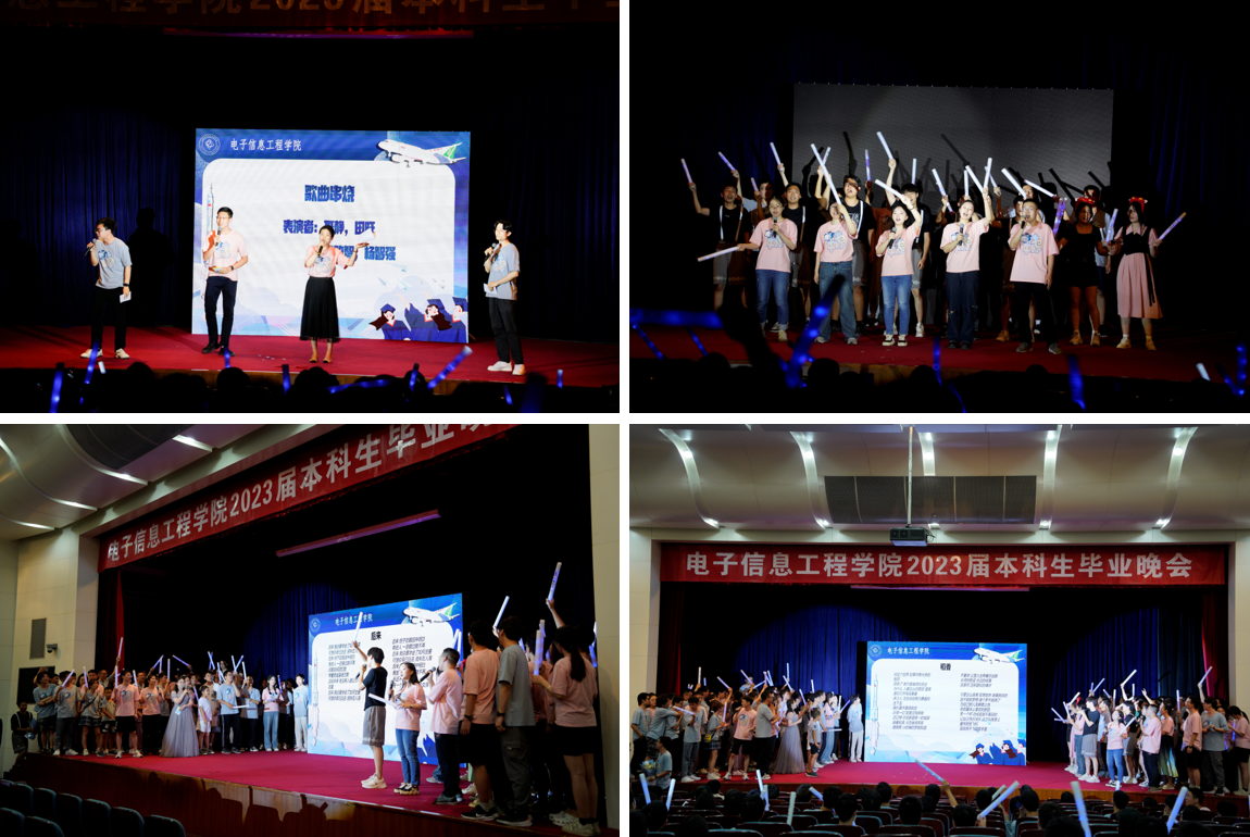 随着四位导员上台献唱,晚会的氛围达到了最高点。在反复设计的串烧歌曲中,导员们向同学们表达了最美好的毕业祝福和殷切期望。在26班同学认真编排的幽默有趣又催人泪下的《全明星大乱斗》表演中,晚会逐渐落下帷幕。最后,由大班同学公投选出的合唱歌曲《后来》和《稻香》的旋律响起,电子信息工程学院2023届“E就乐Er”本科生毕业晚会至此结束。