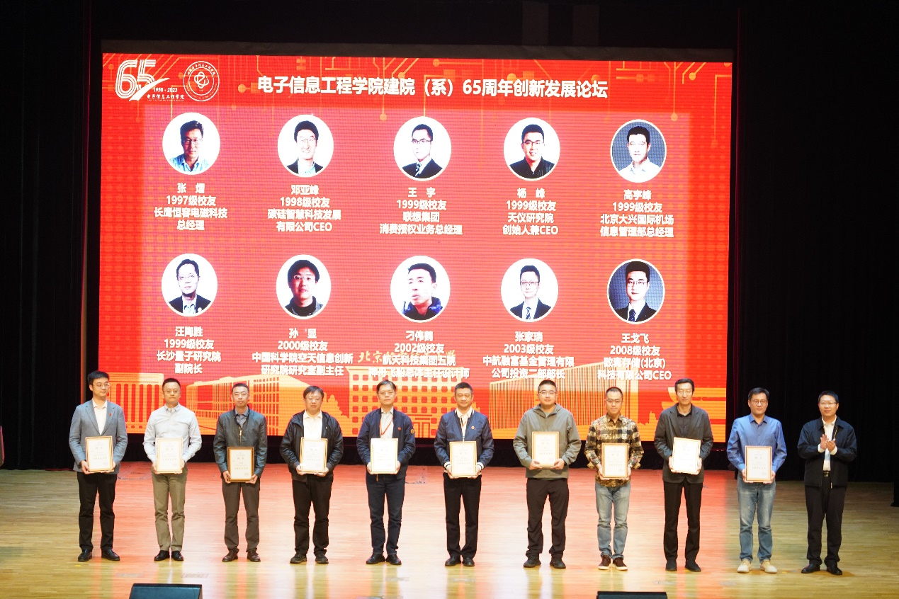 在学院建院(系)65周年之际,在广大校友热心支持下,电子信息工程学院启动了启航校友导师项目,特别邀请在社会各界工作的优秀校友担任在校生的校友导师,推动学院校企协同育人,助力学生职业生涯发展。吕卫锋为首批启航校友导师代表1997级校友张熠,1998级校友邓亚峰,1999级校友王宇、杨峰、高宇峰、汪陶胜,2000级校友孙显,2002级校友刁伟鹤,2003级校友张家瑞,2008级校友王戈飞颁发聘书。