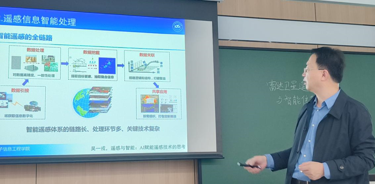 然后,陈老师援引吴一戎院士的论断,提出“遥感大数据时代已经到来。”数据量的急剧增加使遥感技术发生了巨大变化。传统技术面临着数据处理有差距、判断分析效率低、共享分发不畅通与精准服务能力若这四个难题,而智能遥感技术依托与若干创新型算法取得了一定进步但仍然未成体系,具有很大发展空间。