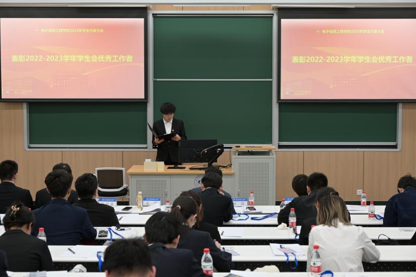 在紧张有序的计票时间中,大会表彰了2022-2023学年电子信息工程学院学生会优秀工作者。由2022级本科生辅导员刘耀鑫宣读名单,专职辅导员聂静老师、田旺老师为受表彰同学颁发证书。
