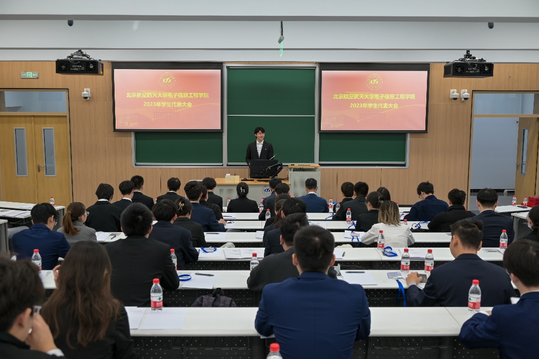 2023年12月6日下午,北京航空航天大学电子信息工程学院2023年学生代表大会在主楼301教室召开。学院党委副书记姜宇,专职辅导员聂静、田旺,2022级本科生辅导员刘耀鑫,北航校学生会代表钟宜典出席会议。学院 2022- 2023年主席团成员高欣、张馨蕊、厉天雨及本科各年级学生代表共81人参加会议。会议由电子信息工程学院2023年学生代表大会筹备委员会(以下简称筹备委员会)委员李绍武主持。
