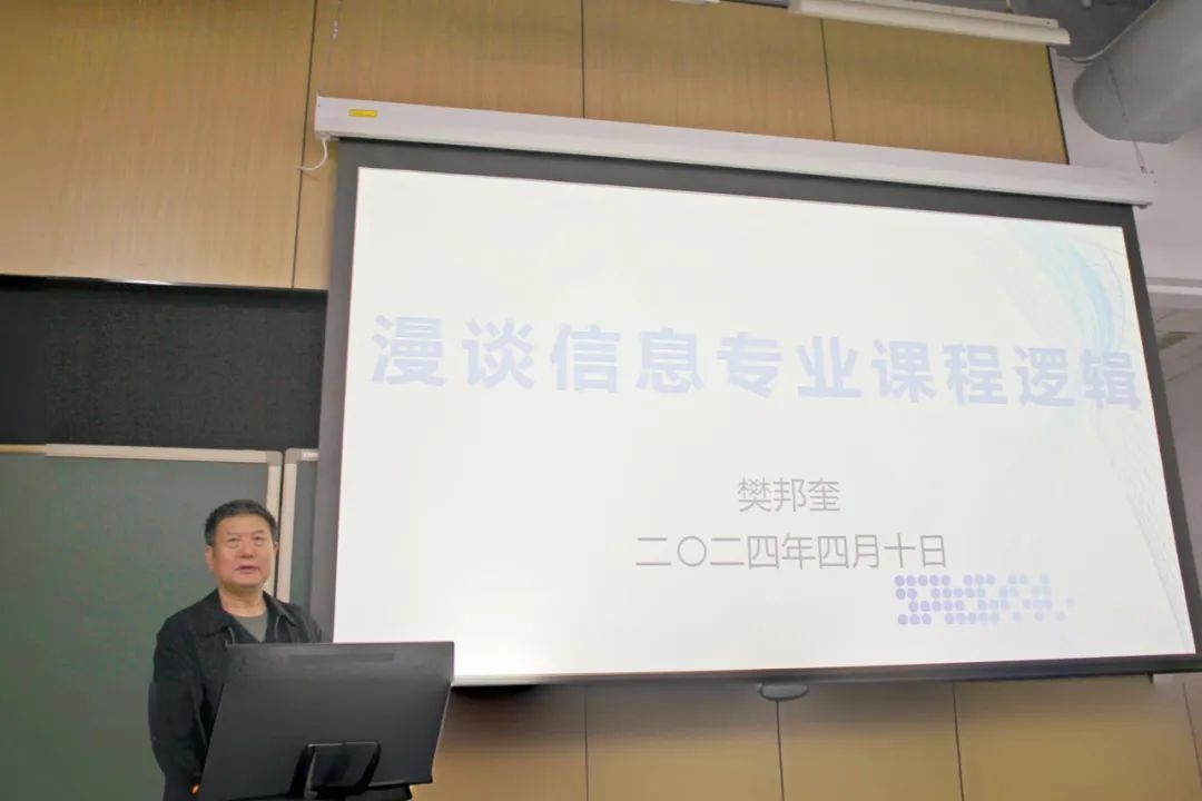 2024年4月10日晚上19点,第七讲《电磁兼容技术前沿》讲座在新主楼F101教室再次召开。本次讲座请到的是中国工程院院士,无人机技术领域学术带头人之一的樊邦奎院士,为我们带来题为“漫谈信息专业课程逻辑”的讲座,旨在带领我们建立对信息专业课程与知识的整体逻辑与正确认识,提升同学们对课程学习的积极性与兴趣,让同学们在以后的学习生活以及科学探索中能走得更加顺利和长远。