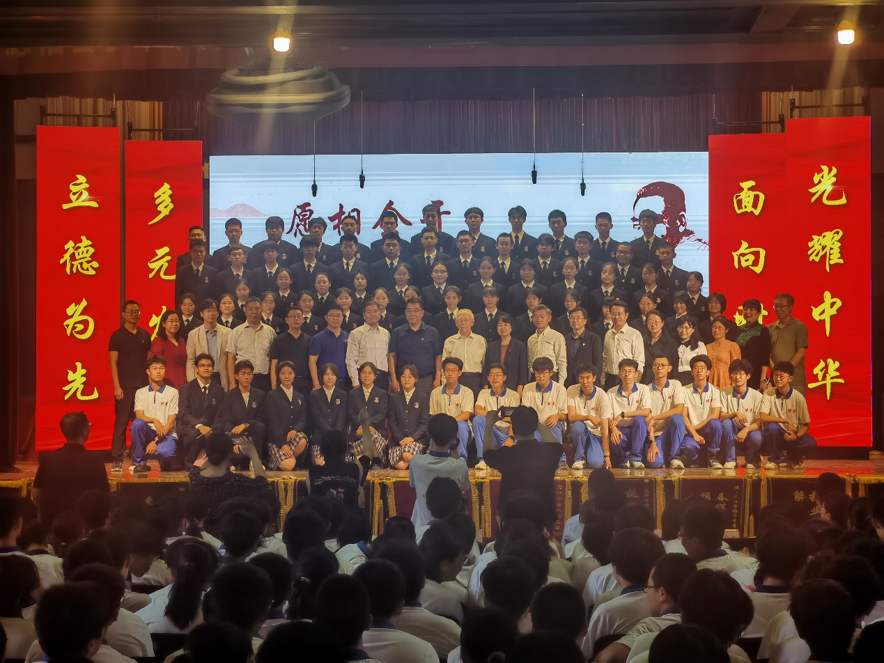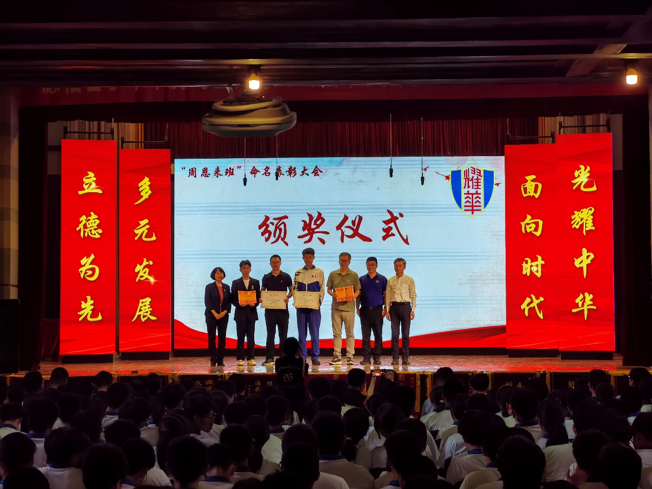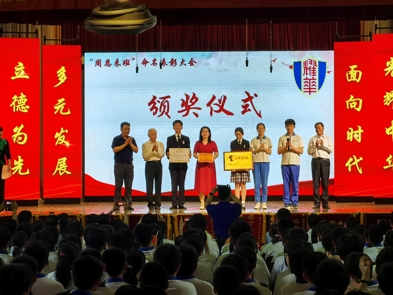 在耀华中学,招生组一行受邀参加耀华中学“周恩来班”表彰大会。冯培德院士为新一届耀华中学“周恩来”班授牌,刘睿主任为受表彰师生颁奖。