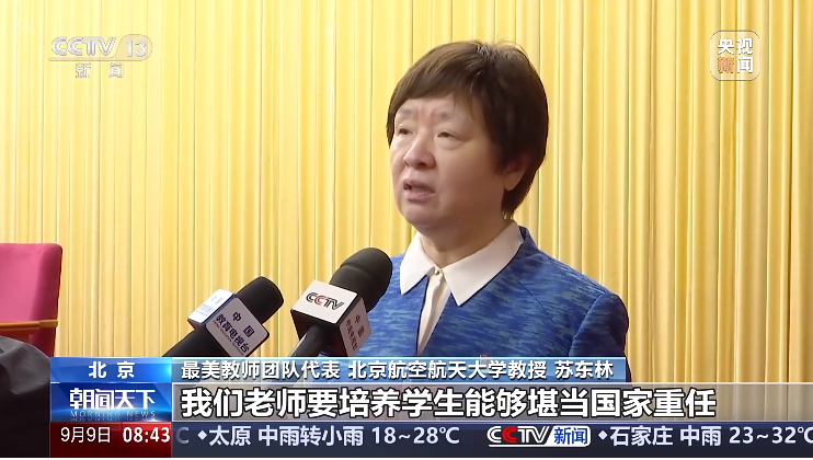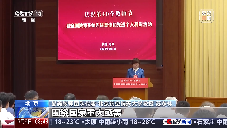 9月8日下午,庆祝第40个教师节暨全国教育系统先进集体和先进个人表彰活动在京举行。全国教书育人楷模、最美教师、全国模范教师、全国优秀教师、全国先进教育工作者等代表接受表彰。北京航空航天大学苏东林院士作为最美教师团队代表在会上发言。“我非常荣幸地成为我国教育强国和人才强国建设的见证者、实践者、传承者。”在红色工程师的“摇篮”里,苏东林坚守理想信念,不断书写科技报国的答卷。“围绕国家重大亟需,我们老师要培养学生能够堪当国家重任,要敢为人先,做国家需要的事。”