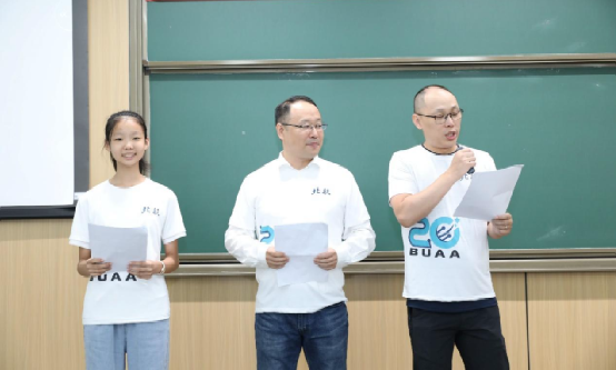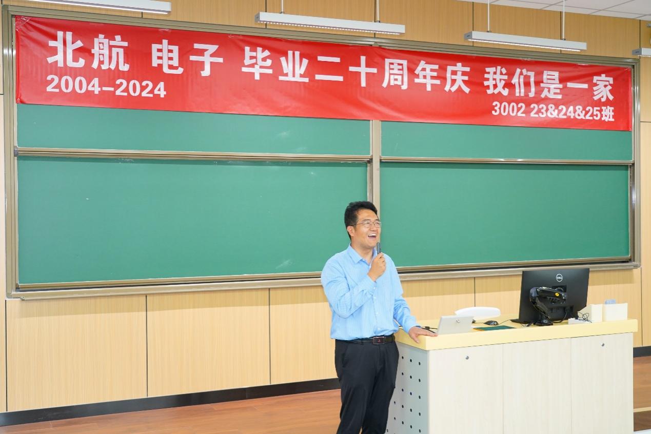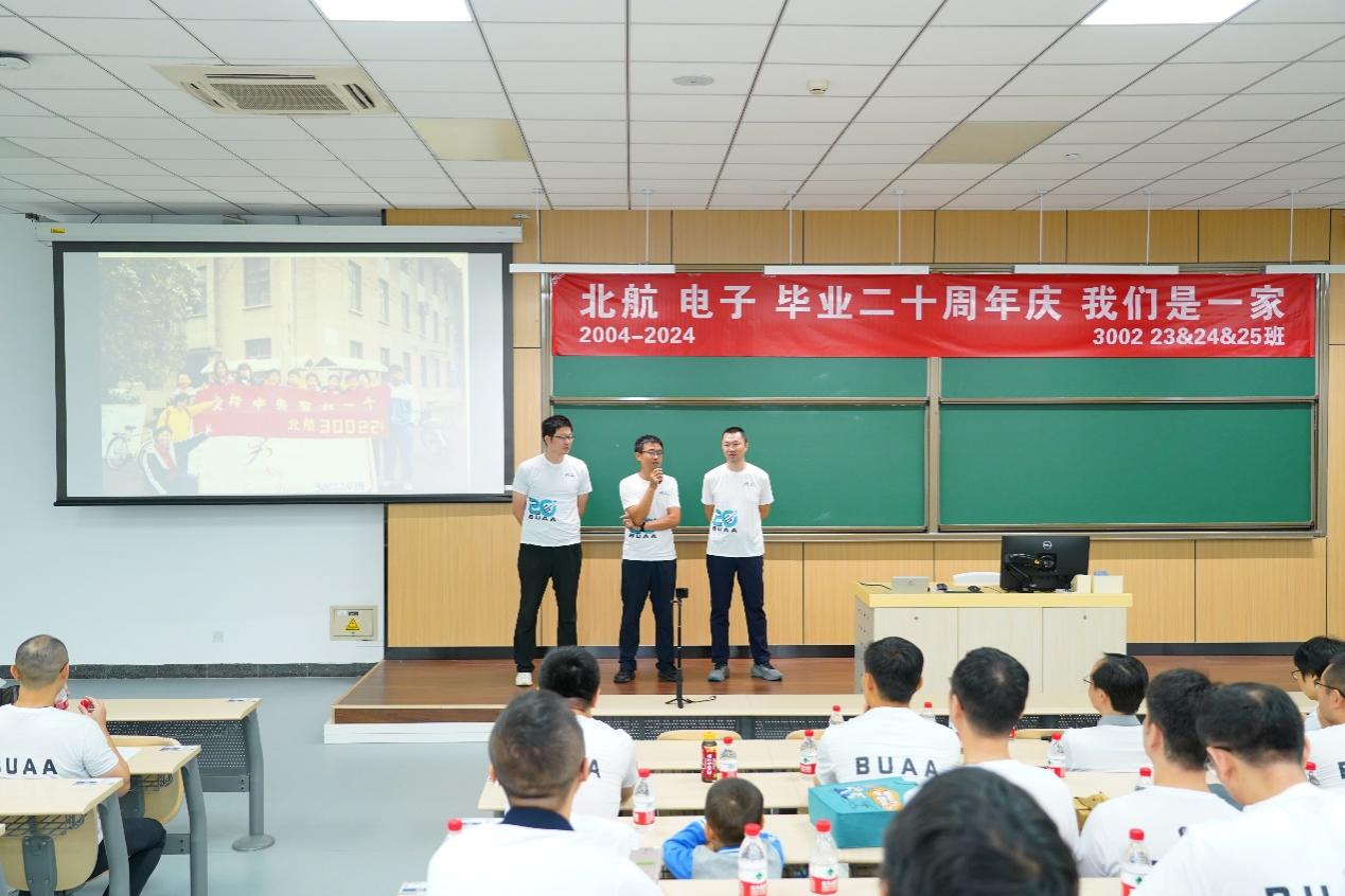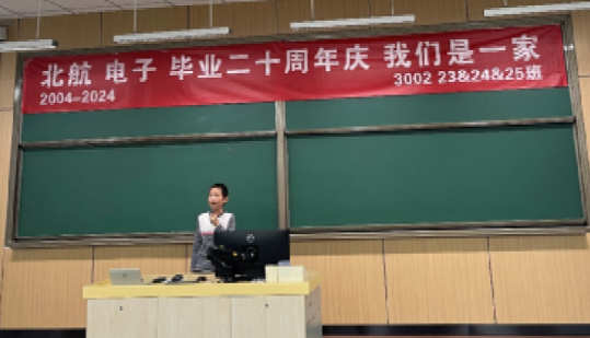 活动首先在学院路校区主M102教室举行,电子信息工程学院党委书记徐亚军出席活动,教职工代表同时也是2000级校友的电子信息工程学院副院长蔡开泉、教师发展中心副主任马坤、电子信息工程学院教师刘婷婷共同出席,2000级300223、300224、300225班校友们一起召开了一场名为“匆匆二十年”的班会。班会由2位毕业校友和1位“航二代”联合主持。