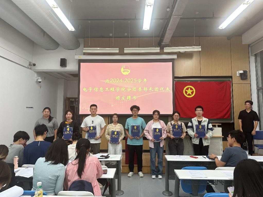 计票过程中,学院分团委书记郝旭春为2023-2024学年电子信息工程学院分团委部长团代表颁发荣誉证书,并为2024-2025学年电子信息工程学院分团委部长团代表颁发聘书。