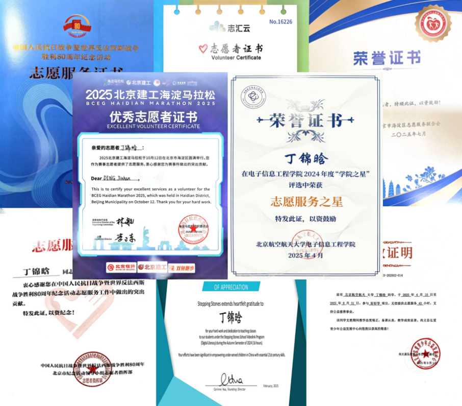 2025年11月12日,北京航空航天大学2024-2025学年十佳志愿者评选圆满落幕,我院丁锦晗同学成功入选!从校园到社会,从国内盛会到国际舞台,她在志愿的道路上步履不停,用实际行动点亮志愿路上的星光,让我们一起来认识一下她吧。