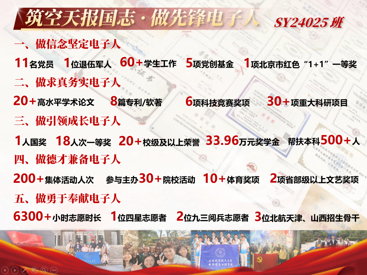 SY24025班在过去一年中以“为国而生、与国同行,做敢为人先、报效祖国的电子人”为目标,全面发展并取得突出成效。
