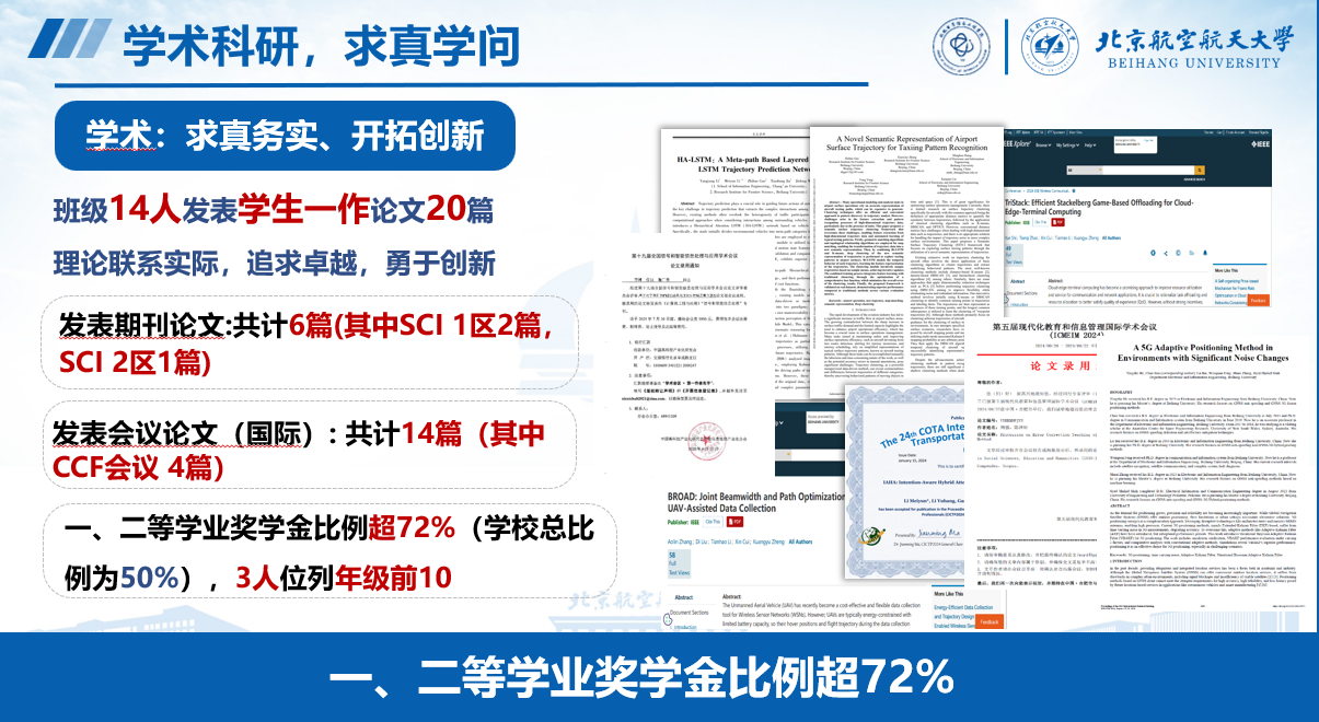 班级学风建设扎实,发表论文20余篇,获得专利7项;斩获“挑战杯”全国特等奖、“冯如杯”一等奖等竞赛奖项6项。获得奖学金33.96万元,67门课程95分以上,半数以上成员投身学院科创体系建设与本科助教工作。班级成员努力成为求真务实、引领成长电子人。