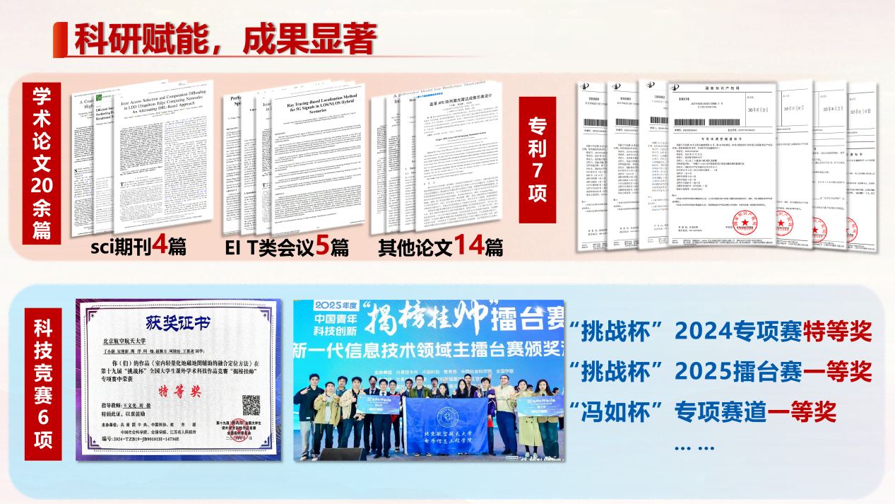 全员与科研导师实现双选匹配,参与实验室课题项目,共获得冯如杯主赛道奖项6项。有7人参与到省部级以上创新创业比赛中,获得揭榜挂帅专项赛擂主2项。在各类学科竞赛中共获国家级奖项10项,省部级38项。